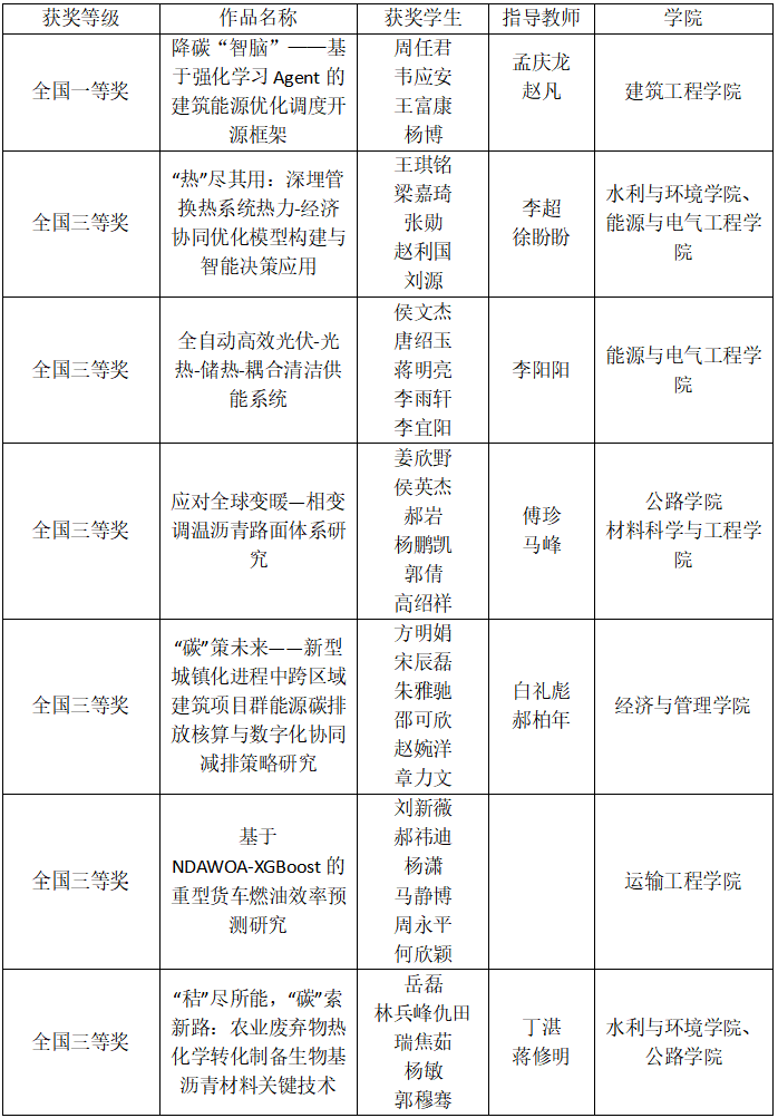 中国研究生“双碳”创新与创意大赛是“中国研究生创新实践系列大赛”主题赛事之一,由教育部学位管理与研究生教育司指导,中国学位与研究生教育学会、中国科协青少年科技中心主办。中国研究生“双碳”创新与创意大赛以“创意启迪智慧、创新驱动发展”为理念,围绕“智慧双碳,创享未来”主题,以激发研究生创新意识,提高研究生创新和实践能力,为国家、社会和企业培养创新型人才为宗旨而设立。本届大赛共吸引全国377所高校和科研院所的4639支队伍近2.6万名师生参赛。经初赛评审,共357支参赛队伍入围全国总决赛。经过激烈角逐,最终我校建筑工程学院孟庆龙和赵凡两位老师共同指导的研究生周任君、韦应安、王富康、杨博的作品“降碳‘智脑’——基于强化学习Agent的建筑能源优化调度开源框架”获得全国一等奖。水利与环境学院、能源与电气工程学院、公路学院、材料科学与工程学院、经济与管理学院、运输工程学院等六个学院的师生获得三等奖6项。