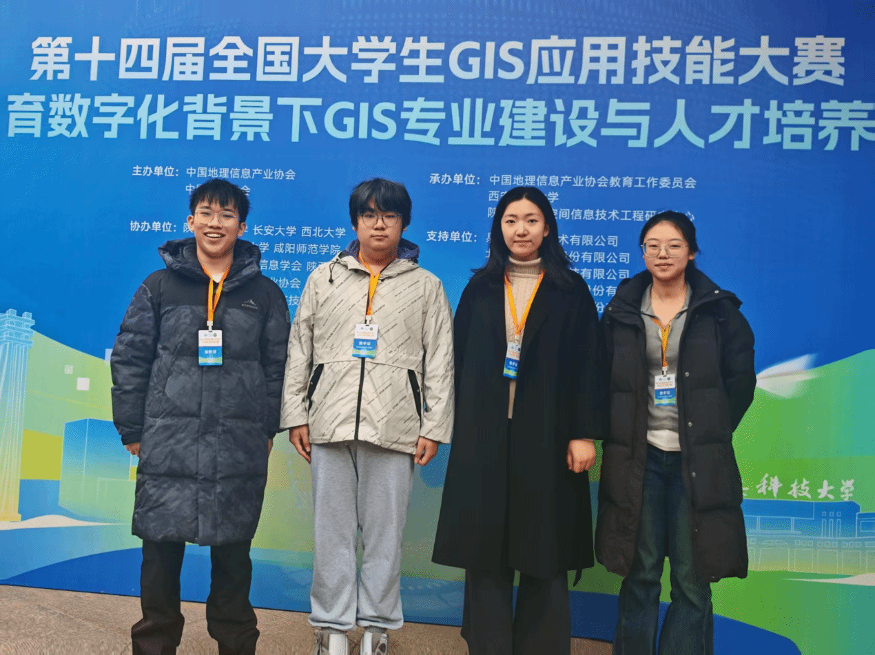 11月14日至16日,第十四届全国大学生GIS应用技能大赛在西安科技大学举办。我校地测学院和土地学院的四名学生(张凯洋、刘天昊、吴烨楠、张梦茹)联合组队,在指导教师赵建林和吴田军的携手带领下,在首届全国大学生GIS应用技能大赛陕西省邀请赛中荣获特等奖,并在此次全国大赛中荣获二等奖。