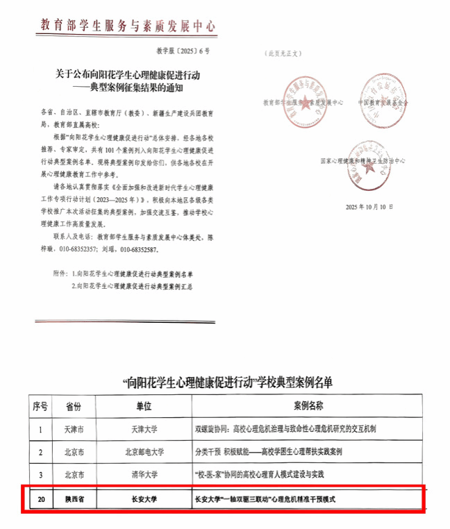 为深入贯彻《全面加强和改进新时代学生心理健康工作专项行动计划(2023—2025年)》,把心理健康作为学生全面发展的前提和基础,五育并举促进学生健康成长,教育部组织实施了“学生心理健康促进行动”,并于2025年6月面向全国征集学生心理健康教育工作典型案例,旨在总结推广各地各校的有效经验和成熟模式,发挥优秀实践的示范引领作用。近日,教育部公布遴选结果,我校申报的《长安大学“一轴双驱三联动”心理危机精准干预模式》入选典型案例。