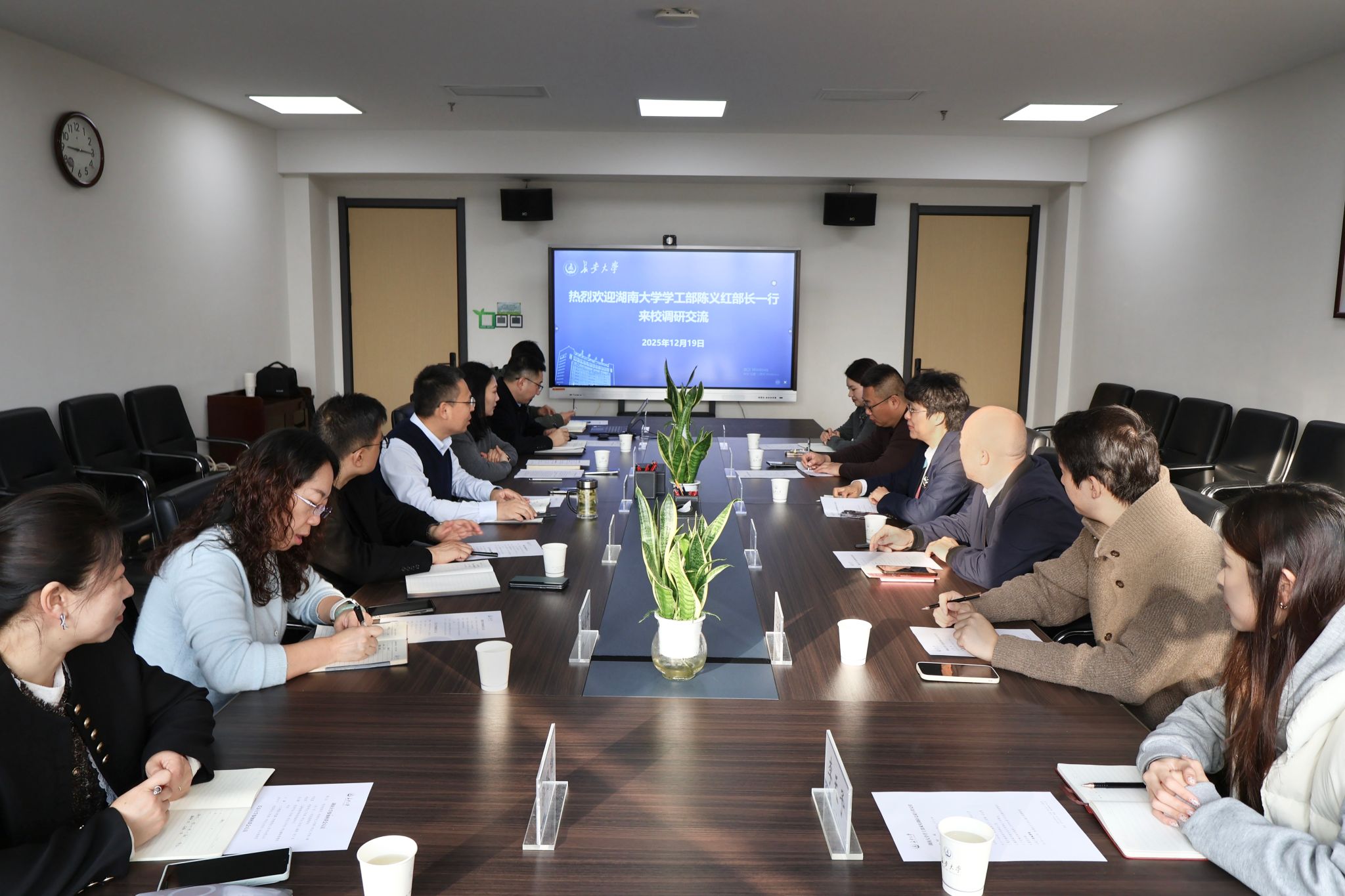 12月19日上午,湖南大学党委委员、学工部部长陈义红一行6人来校调研交流。校党委副书记李文雄会见了陈义红一行。学工部、校团委、信息学院等相关单位负责人参加座谈交流。