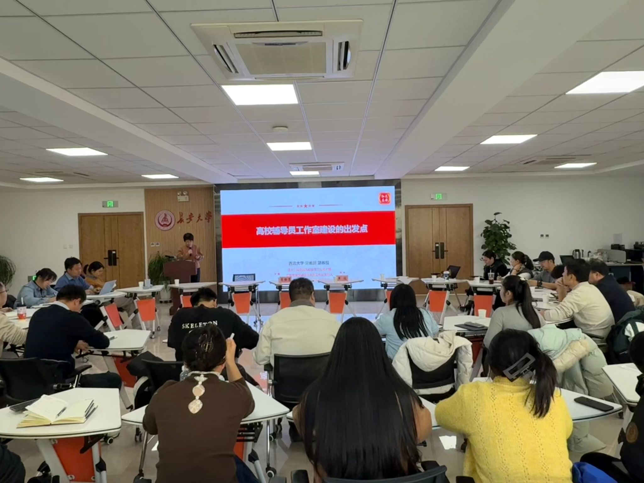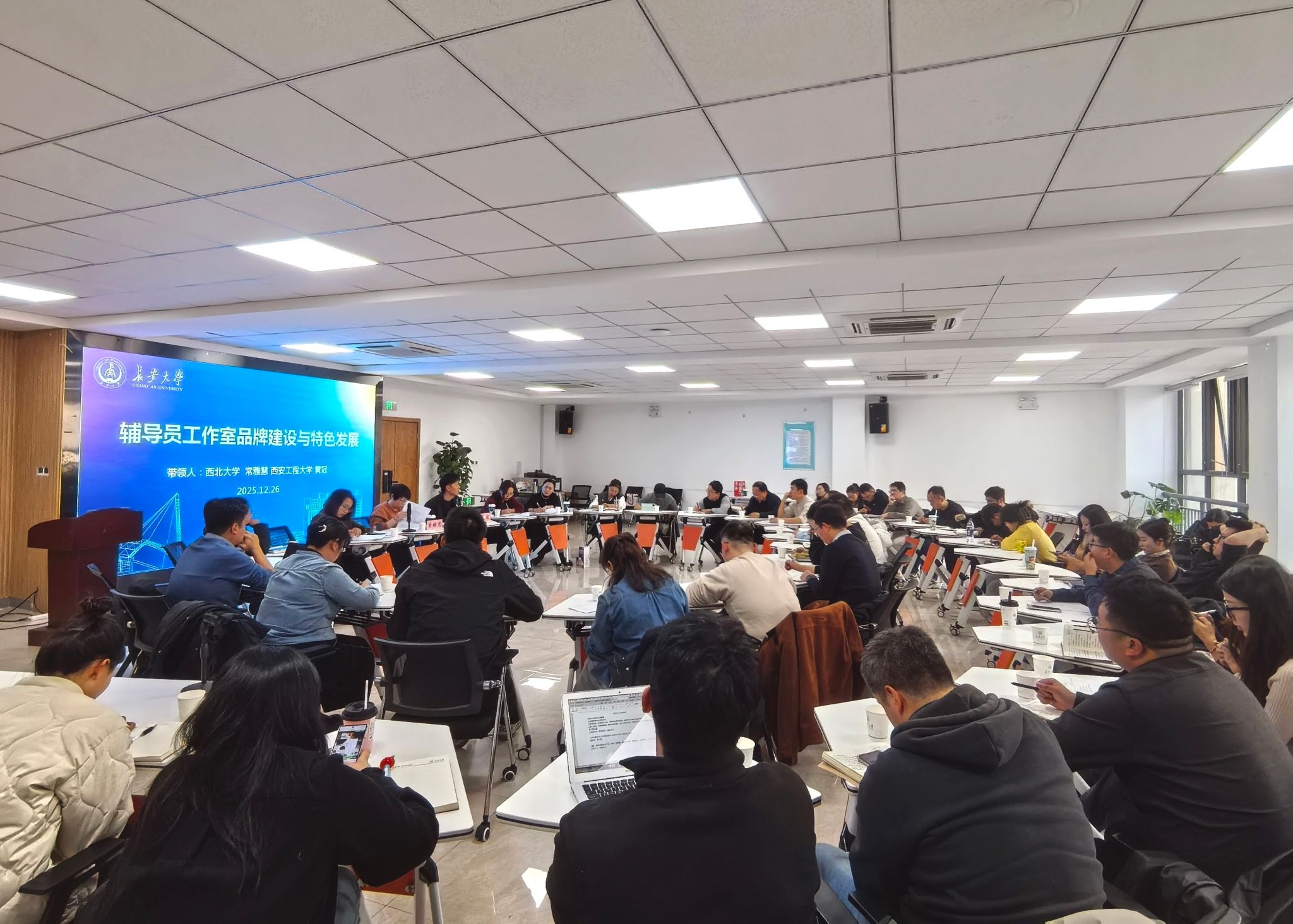 为扎实推进辅导员工作室专业化、品牌化建设,搭建经验交流与实践探索的创新平台,12月26日下午,我校第四十三期辅导员沙龙在朝晖园示范性园区二层团体辅导室举行。本期沙龙以“辅导员工作室品牌建设与特色发展”为主题,特邀首批教育部高校辅导员名师工作室“红色基因”辅导员工作室主持人、西北大学辅导员常雅慧,教育部高校辅导员名师工作室“一站式”数智新“+”辅导员工作室主持人、西安工程大学校团委创新实践部部长黄冠担任主讲嘉宾。沙龙由心理健康教育与咨询中心副主任刘飞主持,我校各辅导员工作室主持人及核心成员40余人参加。