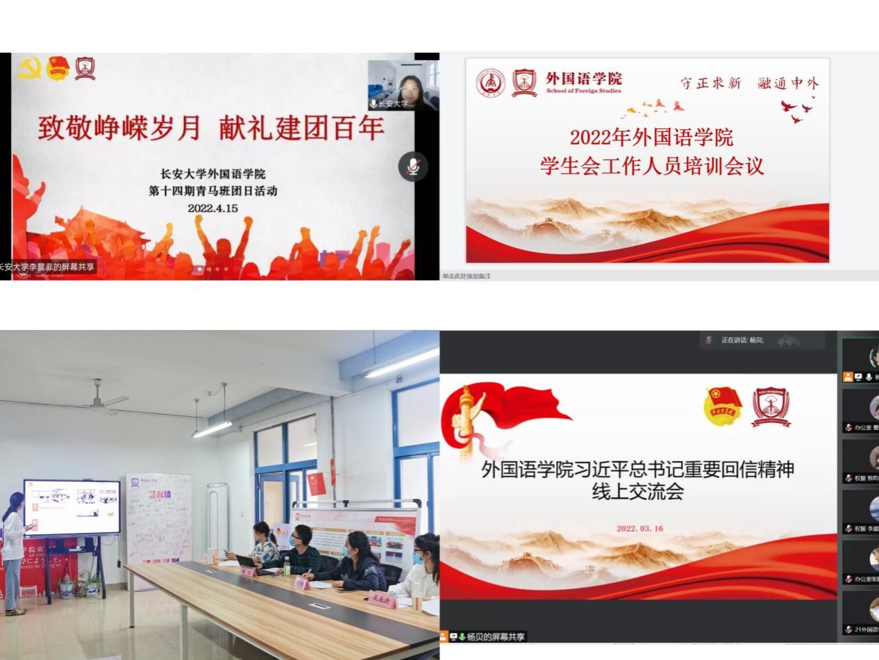 组织学习教育,加强思想引领。学院团委组织开展了一系列主题教育活动,夯实学院青年团员理论基础,提升实践能力,培养有信仰、讲政治的新时代外语人。组织全院团员青年学习习近平总书记冬奥会重要回信精神;积极开展五四评优答辩会,树立优秀典型、弘扬榜样精神;院青马班开展“致敬峥嵘岁月,献礼建团百年”线上主题教育活动,进一步培养团员青年的责任感、使命感;院学生会召开春季线上培训会,总结一年来工作的成绩与不足,增强服务意识,提升服务水平,为创建同学满意的优秀学生组织而继续努力。