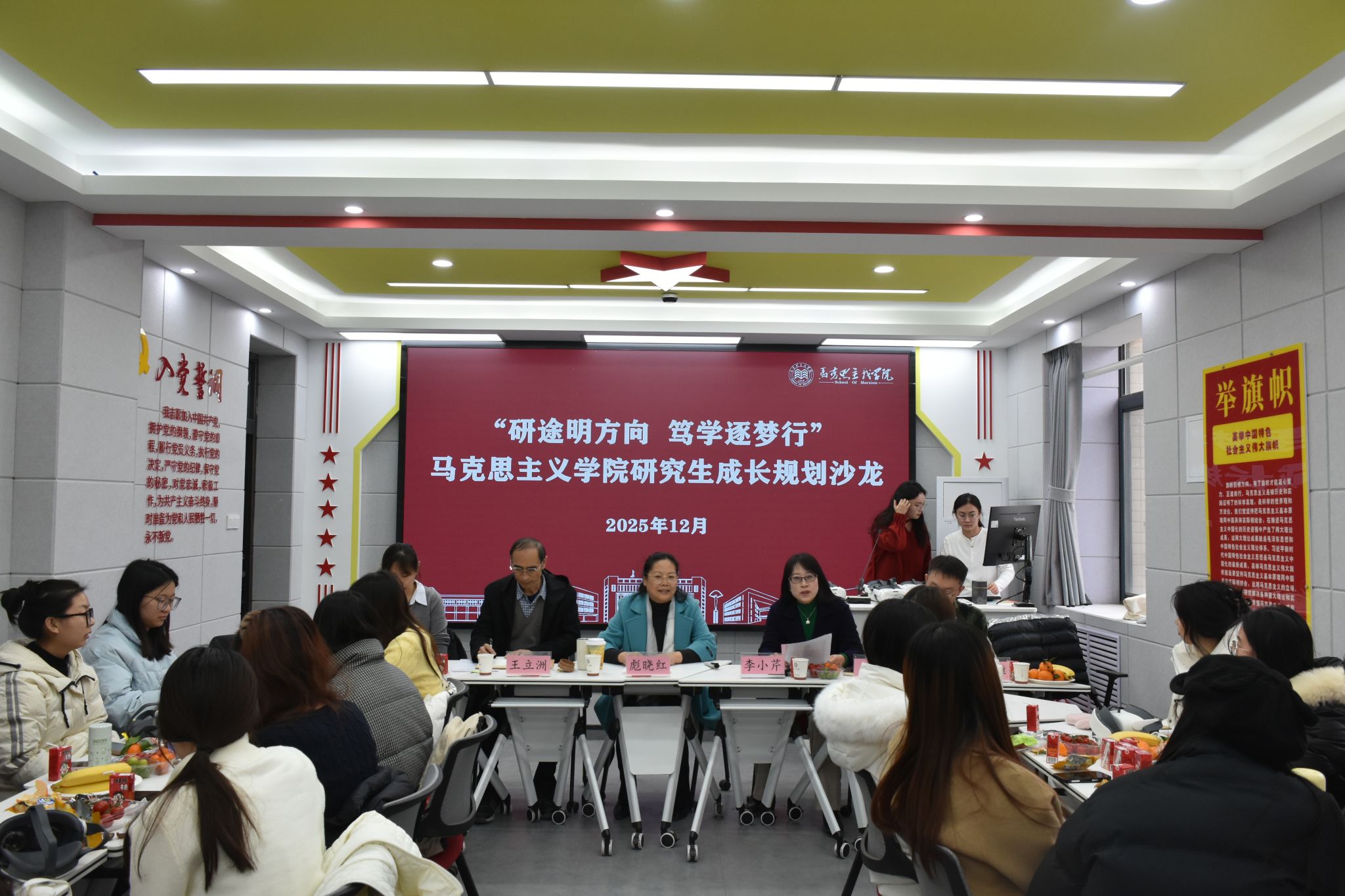 12月3日下午,马克思主义学院在南校区主楼思政课虚拟仿真体验教学中心举办“研途明方向,笃学逐梦行”研究生成长规划沙龙。马克思主义学院研究生导师彪晓红教授担任分享嘉宾,学院党委书记李小芹、副院长王立洲,学办全体辅导员,2025级全体研究生参加沙龙。沙龙由李小芹主持。
