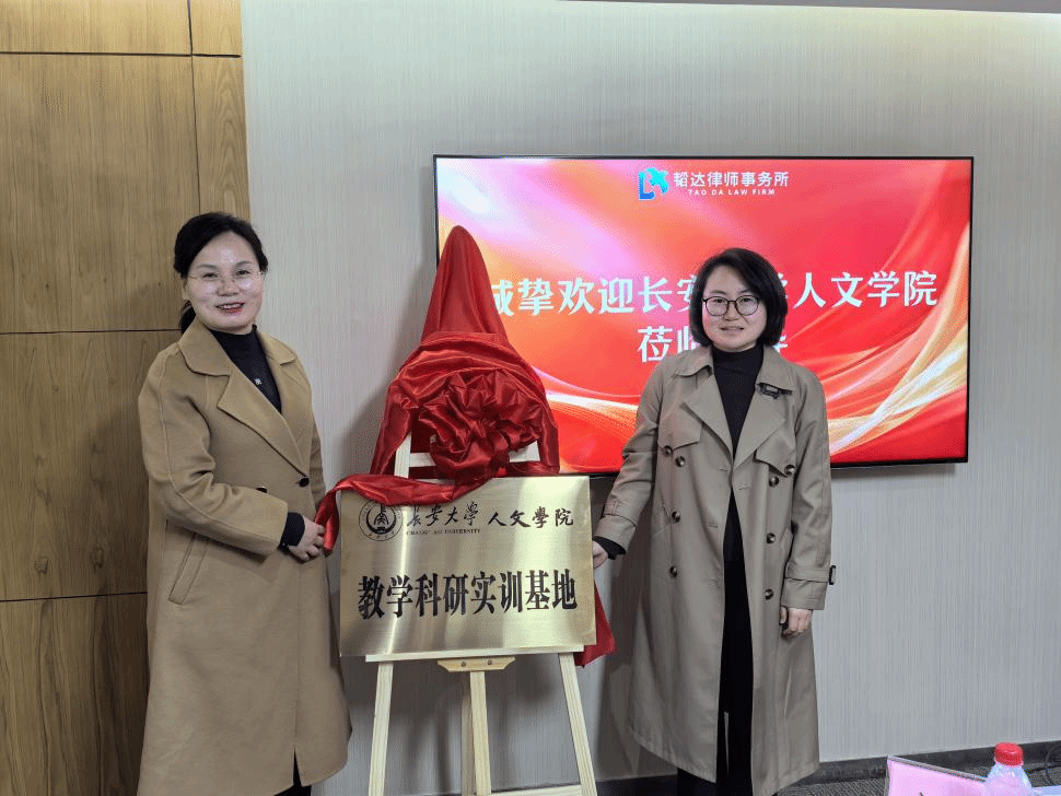 为拓宽毕业生就业渠道,精准对接企业用人需求,扎实推进毕业生就业服务工作,3月16日下午,人文学院党委书记何红娟、副院长李妮带领学院相关负责人、各专业教师代表前往陕西韬达律师事务所开展访企拓岗活动,双方正式签署实践基地合作协议,共同为“长安大学人文学院教学科研实训基地”揭牌。陕西韬达律师事务所主任戴晓梅律师、副主任刘娇律师、谢立律师及律所骨干律师参与本次活动,双方围绕法学人才培养、实习就业合作、产学研协同发展等方面展开深入交流。