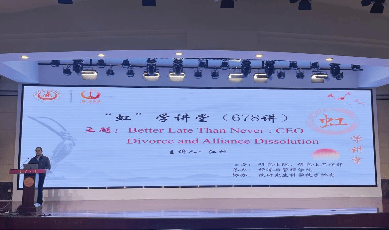 11月12日下午,由研究生院、研究生工作部主办,经济与管理学院承办,校研究生科学技术协会协办的“虹”学讲堂第678讲在南校区北院学术交流中心举行。西安交通大学江旭教授作题为“Better Late Than Never : CEO Divorce and Alliance Dissolution”的报告,相关学院共280余名师生参加讲座。