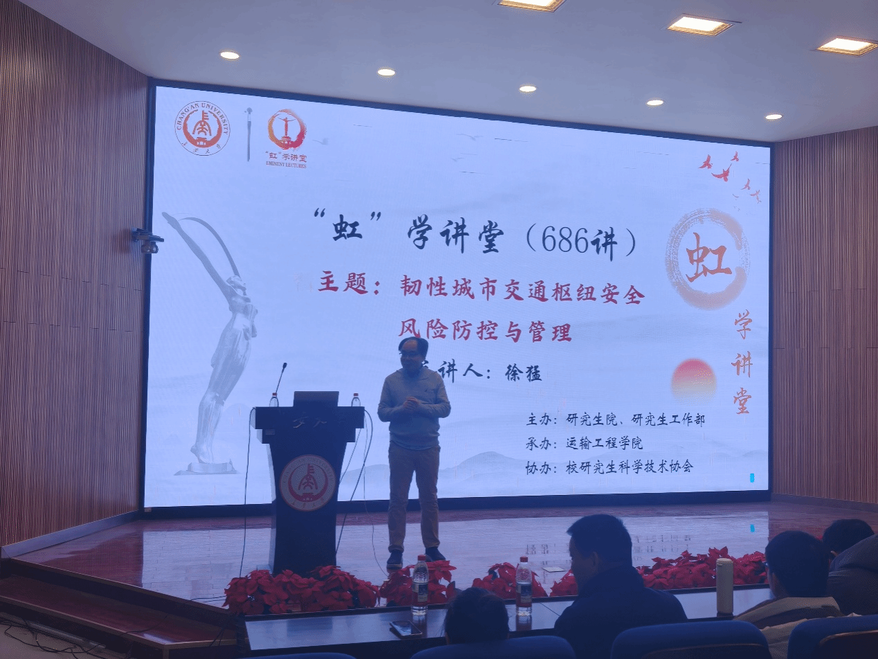 12月5日上午,由研究生院、研究生工作部主办,运输工程学院承办,校研究生科学技术协会协办的“虹”学讲堂第686讲在南校区东院伯声报告厅举行。北京交通大学徐猛教授作题为“韧性城市交通枢纽安全风险防范与管理”的报告,相关学院200余名师生参加讲座。