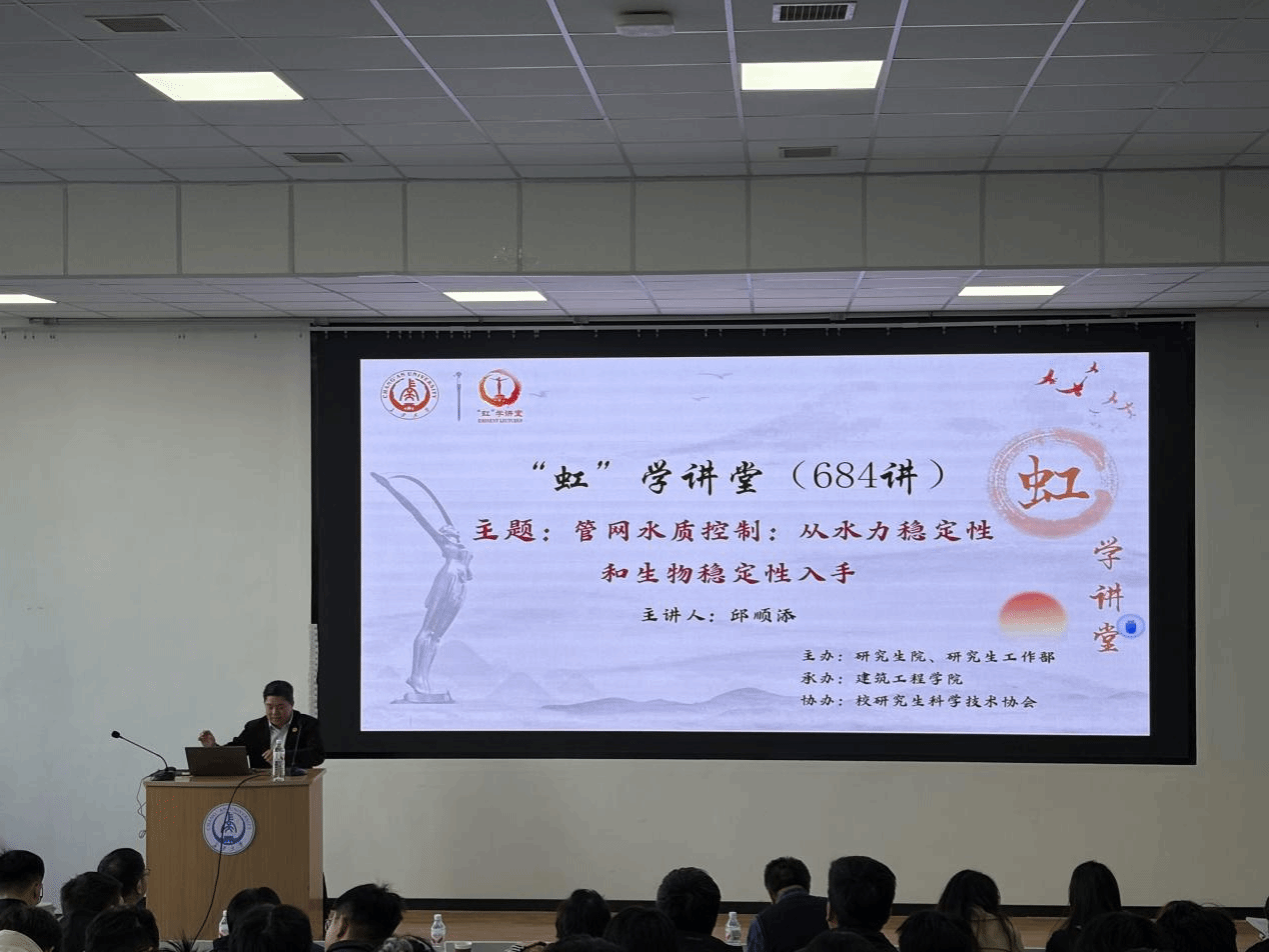 11月29日下午,由研究生院、研究生工作部主办,建筑工程学院承办,校研究生科学技术协会协办的“虹”学讲堂第684讲在南校区西院综合楼报告厅举行。中山大学邱顺添教授作题为“管网水质控制:从水力稳定性和生物稳定性入手”的报告,建筑工程学院杨利伟教授主持报告会,相关学院共80余名师生参加讲座。