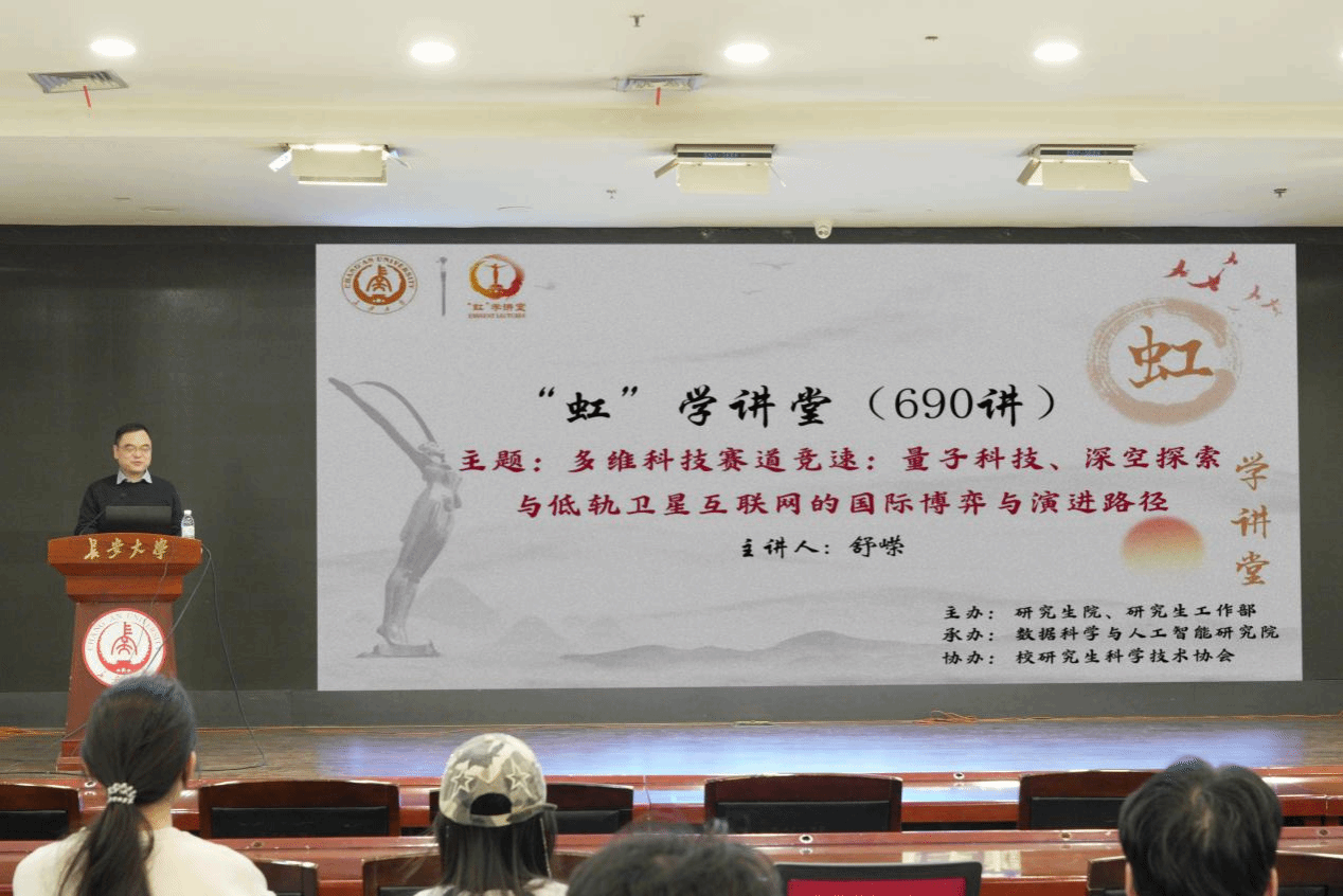 12月26日下午,由研究生院、研究生工作部主办,数据科学与人工智能研究院承办,校研究生科学技术协会协办的“虹”学讲堂第690讲在北校区长安文化艺术中心三楼多功能厅举行。中国科学院微小卫星创新研究院研究员舒嵘作了题为“多维科技赛道竞速:量子科技、深空探索与低轨卫星互联网的国际博弈与演进路径”的报告,数据科学与人工智能研究院高涛教授主持报告会,相关学院共200余名师生参加讲座。