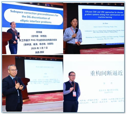 研讨会聚焦偏微分方程的理论分析、高效算法及科学计算应用,旨在推动传统数值方法与深度学习技术的深度融合与创新发展。来自北京应用物理与计算数学研究所、中国科学院数学与系统科学研究院、清华大学、北京大学、复旦大学、上海交通大学、香港理工大学、宁波东方理工大学、长安大学等单位的20余位专家学者围绕椭圆界面问题的子空间校正预条件子、重构间断逼近方法、SAV方法在优化与机器学习中的应用、基于最优控制的生成模型、科学机器学习案例分析、Q-张量流的能量稳定格式、可压缩流体的时空高精度算法、深度学习在间断问题中的应用等主题作报告。各位报告人与现场参会人员展开了热烈的交流讨论,与会代表纷纷表示,报告内容前沿、视角多元,充分展现了传统数值方法与人工智能深度融合的广阔前景,拓宽了参会者的学术研究视野,为后续的科研工作提供了全新的思路与方向,也为高校之间的学术合作与人才交流搭建了重要桥梁。