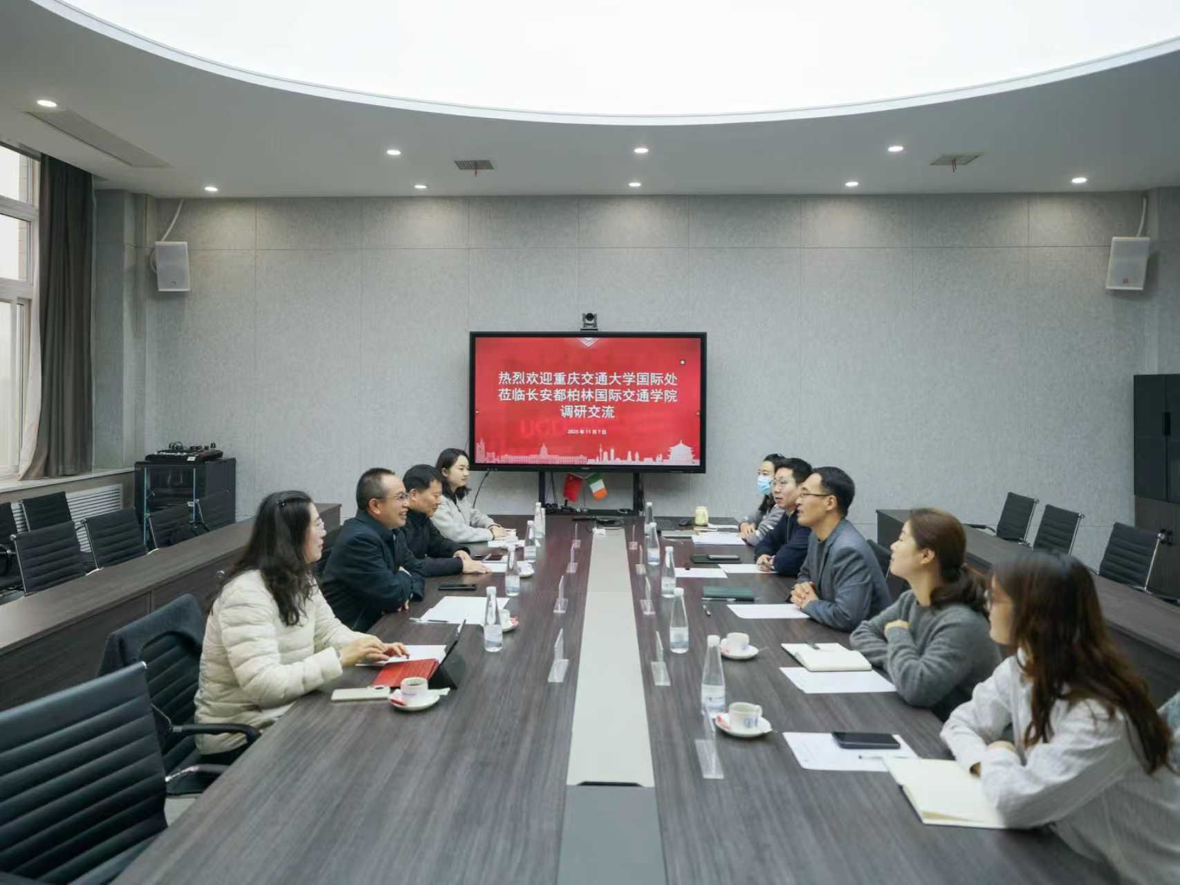 11月7日上午,重庆交通大学国际处处长毛明勇一行4人来访长安都柏林国际交通学院,就中外合作办学机构申报及运行管理相关事宜进行调研交流。国际处副处长周珍珍、学院党总支书记赵亮、副院长李程及相关人员参加座谈会。