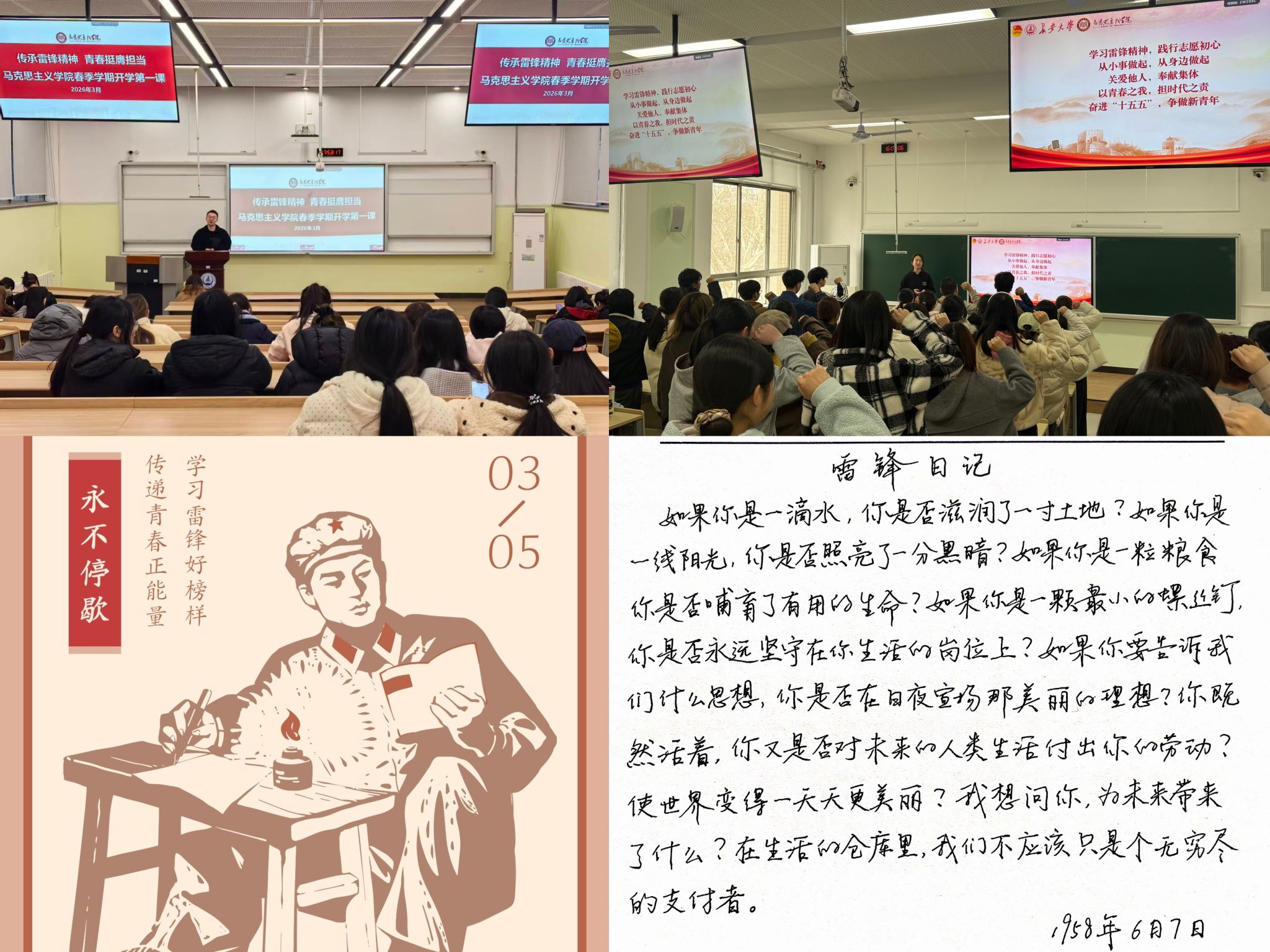 为进一步弘扬“奉献、友爱、互助、进步”的志愿精神,3月以来,马克思主义学院以“弘扬雷锋精神,青春挺膺担当”为主题开展系列活动,推动雷锋精神与理论学习、校园实践、社会服务深度融合,引导青年学子在奉献中厚植家国情怀、彰显青春担当。