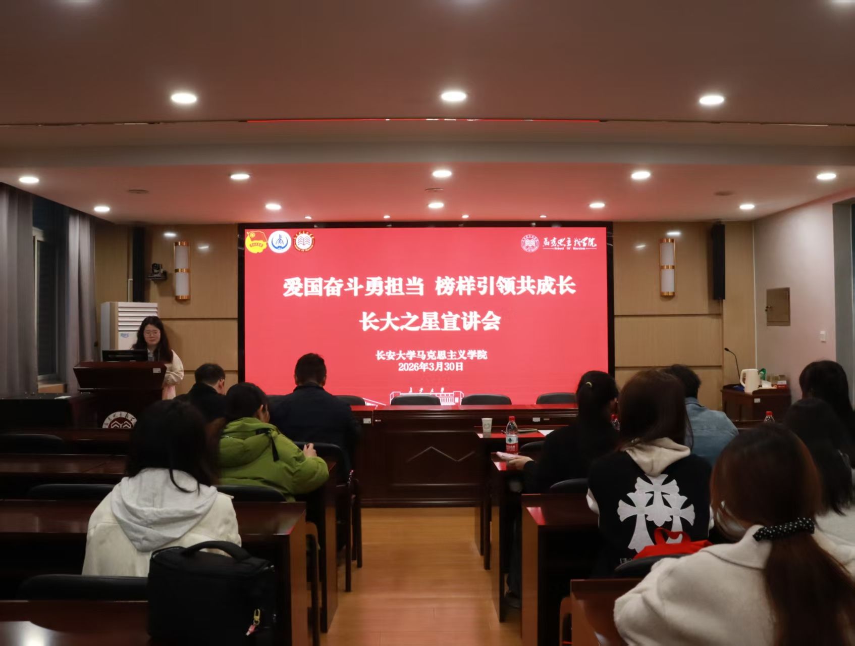 为扎实推进新时代立德树人工程,充分发挥朋辈榜样示范引领作用,营造奋发向上的院风学风,引导和激励青年学生树立远大理想、矢志求学求知,3月30日,马克思主义学院在南校区基础楼503报告厅举办“爱国奋斗勇担当·榜样引领共成长”长大之星宣讲会。院党委副书记冯迪、院学办主任兼团委书记秦丰、本科生辅导员刘堃以及2025级全体本科生参加活动。会议由刘堃主持。