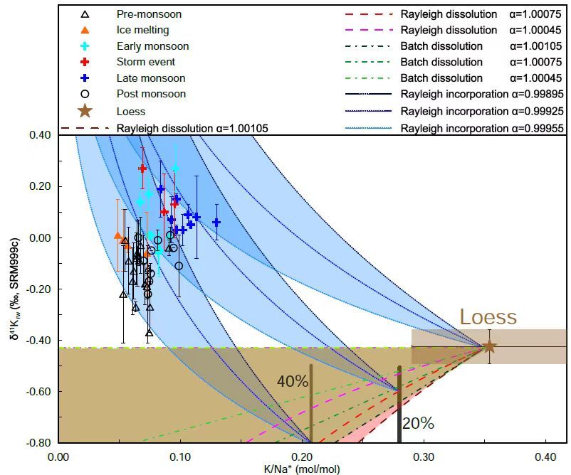 研究表明,河水中的溶解态的K不仅主要来自于硅酸盐岩风化,还首次在季节尺度上发现巨大的钾同位素分馏,由此打通了河水δ⁴¹K用以示踪空间上和季节上的硅酸盐岩风化强度的链条。后续可能可以通过海洋粘土矿物的K同位素对地球历史上不同时期的硅酸盐岩风化强度进行重建,进而理解地球是如何通过化学风化的调节为我们提供了一个恒温、恒压、恒氧、恒大气碳的“完美温室”。海洋钾同位素变化也可以完全由化学风化来解释,同时解决了化学风化的示踪和海洋钾同位素的变化难以解释两大难题。