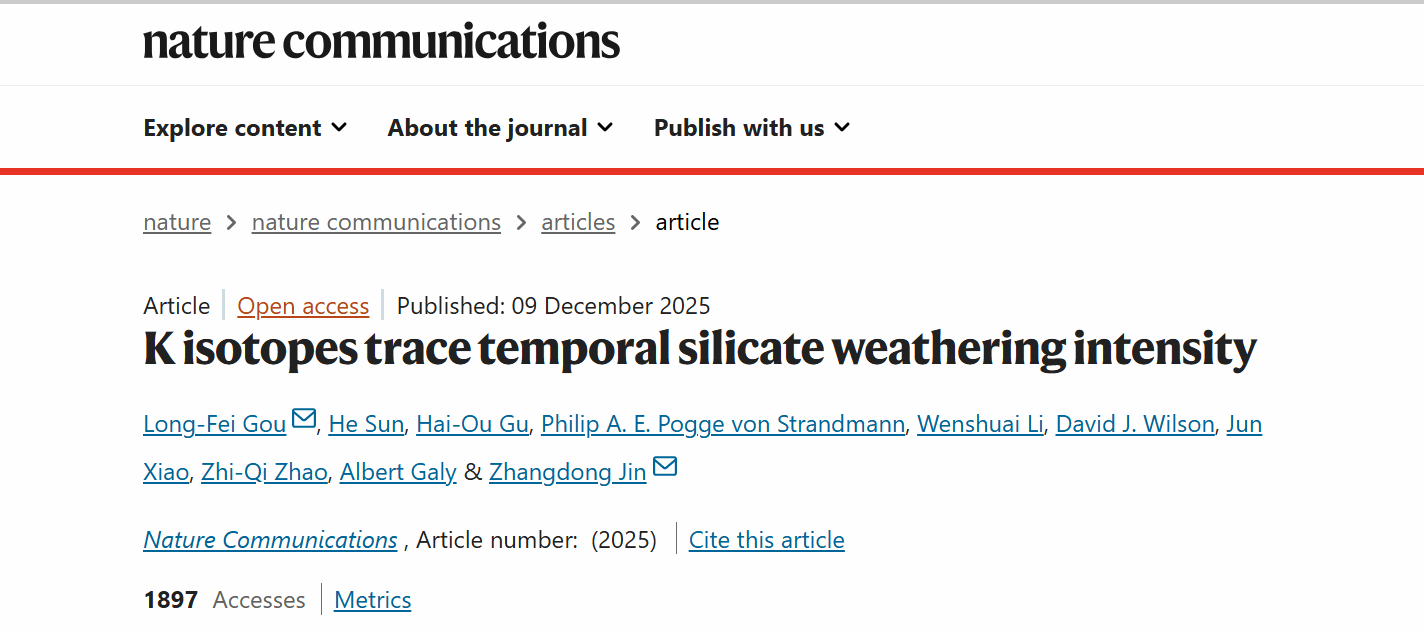 12月9日,土地工程学院科研团队在国际顶尖学术期刊《Nature Communications》发表题为“Kisotopes trace temporal silicate weathering intensity” 的最新研究成果。长安大学为论文第一完成单位,土地工程学院苟龙飞副教授为第一作者,我校外聘导师、中国科学院地球环境研究所金章东研究员为通讯作者。