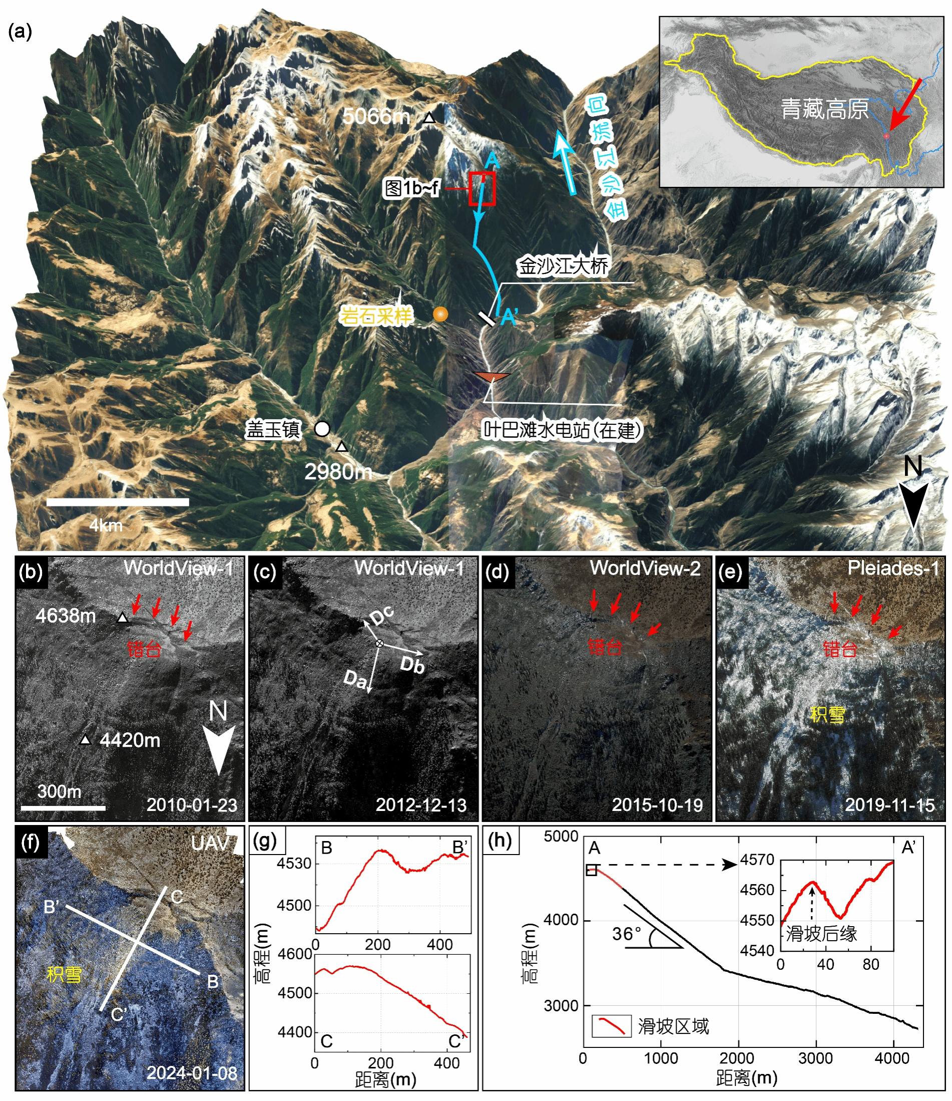 高位远程滑坡是高山峡谷区最具破坏力的地质灾害类型之一,往往具有隐蔽性强、规模大、运动距离远等特点,常规手段难以实现早期识别和监测。研究团队利用2007–2023年间多平台合成孔径雷达卫星观测影像,采用干涉合成孔径雷达(InSAR)时间序列技术,首次在青藏高原交通廊道金沙江大桥附近发现一处正在活动的大型岩质滑坡——古巴滑坡。该滑坡平面面积约0.17km²,体积约840万立方米,距正在建设的金沙江大桥和叶巴滩水电站直线距离分别约4km和7km,严重威胁国家重大工程施工建设及未来安全运营。
