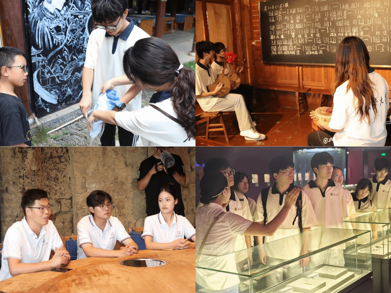 在黔西南州博物馆,从融合多民族元素的夜郎青铜器纹饰,到描绘古代民族交往的陶器生活场景,队员们深刻理解了“中华文化多元一体”的历史根基。在中华布依八音堂,沉浸式非遗体验深化文化认同:与研学孩童协作完成扎染,绘制蓝白蝴蝶T恤;通过观摩传统农具体悟农耕智慧;体验国家级非遗“布依八音坐唱”,在胡弦与刺鼓的悠扬铿锵中感受文化魅力。作为省级民族团结示范村,普梯村(少数民族人口占40%)各族群众共庆节日、共商村务、共兴产业的和谐图景,以及“民族通婚促亲情”“民俗共庆聚人心”等生动实践,让“各民族一家亲”理念深入人心。实践队还与上海视觉艺术学院团队共办“村晚”,在歌舞互动中深化交流,让民族团结之花绚丽绽放。