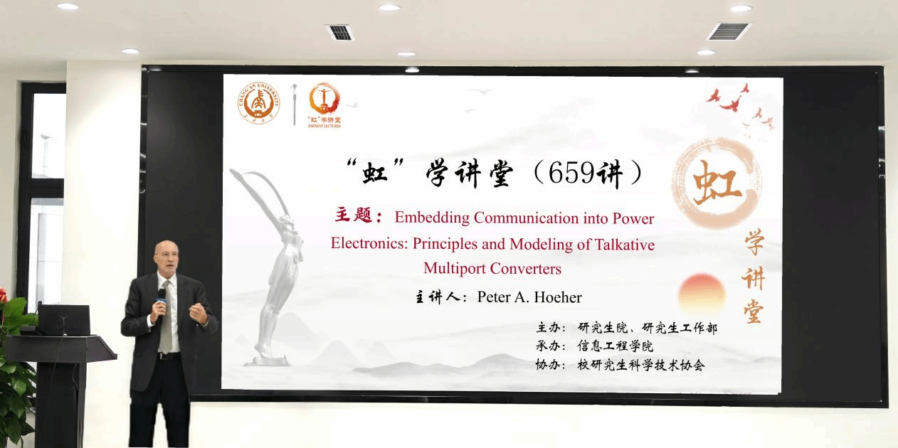 10月10日下午,由研究生院、研究生工作部主办,信息工程学院承办,校研究生科学技术协会协办的“虹”学讲堂第659讲在北校区明德园创新大厦101报告厅举办。德国基尔大学Peter A.Hoeher教授作题为“Embedding Communication into Power Electronics:Principles and Modeling of Talkative Multiport Converters”的报告,信息工程学院陈鹏副教授主持报告会,相关学院共130余名师生参加讲座。