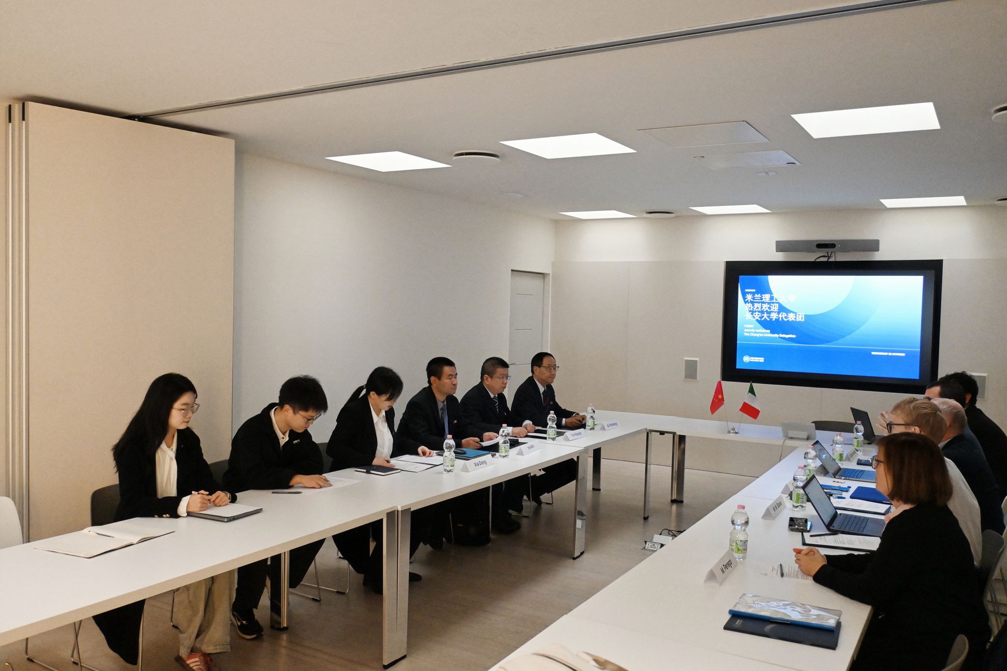 在意大利米兰理工大学访问期间,访问团会见了国际关系事务代表Gabriele Della Vecchia。双方就学生交流、联合培养及科研合作等议题进行了务实磋商。会上双方商定续签既有的交换生项目协议,并拟新增签署一项“3+1+2”本硕连读培养协议。