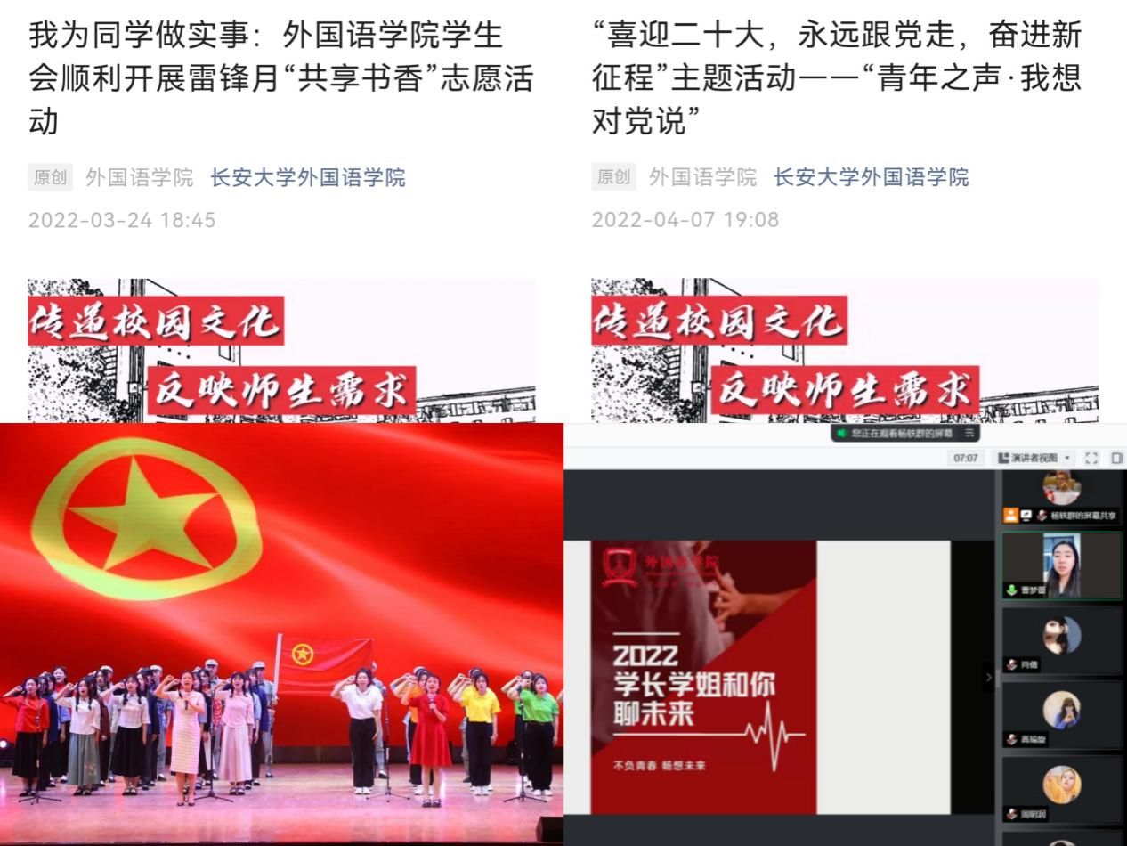 组织学习教育,加强思想引领。学院团委组织开展了一系列主题教育活动,夯实学院青年团员理论基础,提升实践能力,培养有信仰、讲政治的新时代外语人。组织全院团员青年学习习近平总书记冬奥会重要回信精神;积极开展五四评优答辩会,树立优秀典型、弘扬榜样精神;院青马班开展“致敬峥嵘岁月,献礼建团百年”线上主题教育活动,进一步培养团员青年的责任感、使命感;院学生会召开春季线上培训会,总结一年来工作的成绩与不足,增强服务意识,提升服务水平,为创建同学满意的优秀学生组织而继续努力。