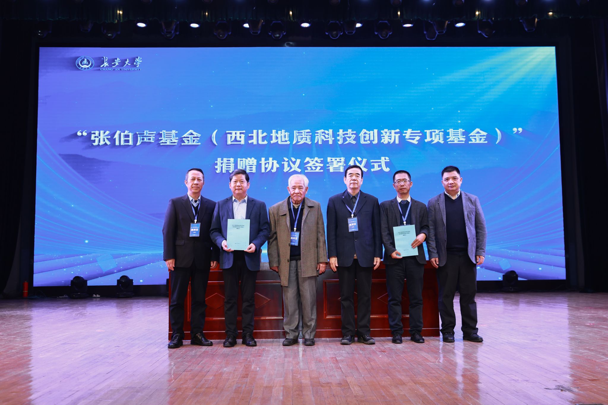 尹立河与长安大学副校长黎开谊共同签署了《张伯声基金(西北地质科技创新专项基金)捐赠协议》。张国伟院士、王双明院士、计文化、长安大学副校长李振洪上台见证。这一协议的签署,标志着各方合作进入了崭新的阶段,为传承科学精神、服务国家战略需求搭建了更为坚实的平台。